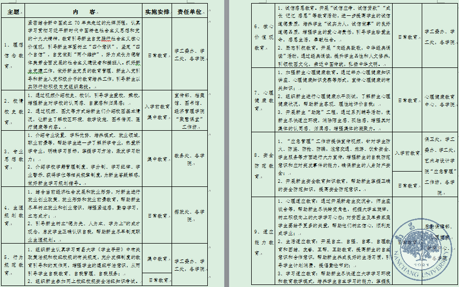 入学教育除开展主题为“大学生课程思政,从新生军训扣好第一粒扣子做起”的军事训练外,还包括理想信念教育、校情校史教育、专业思想教育、生涯规划教育、行为规范教育、核心价值观教育、心理健康教育、安全防范教育、适应能力教育等主题教育,并将举行“向经典致敬,中华经典诵读”等比赛活动。