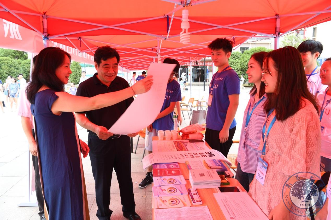 火车站、汽车站,新生们都能看到南昌大学迎新咨询接待点,在这里学校为新生及家长提供了专车接送站服务。餐饮方面,食堂根据新生报到时间的不固定,延长用餐时间,开设值班专窗。由于陪同来校报到的新生家长人数众多,学校还专门布置室内体育馆,配有草席、饮用水、驱蚊水等生活用品,为部分新生家长解决住宿问题。