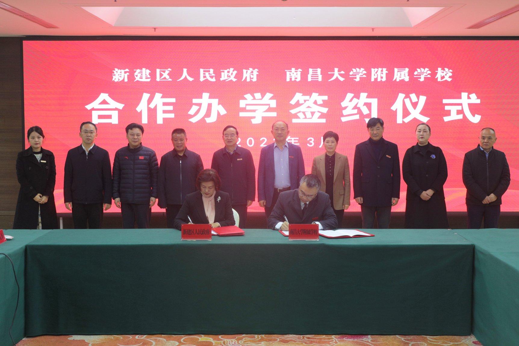 南昌大学附属学校党委副书记、校长黄海啸与新建区副区长胡燕琴代表双方签署校地合作办学协议。根据协议,双方将本着互惠、互信、互利原则,充分发挥各方资源优势,在基础教育领域开展深度合作,共建两所合作学校,办好人民满意的教育,共同打造优质基础教育品牌。