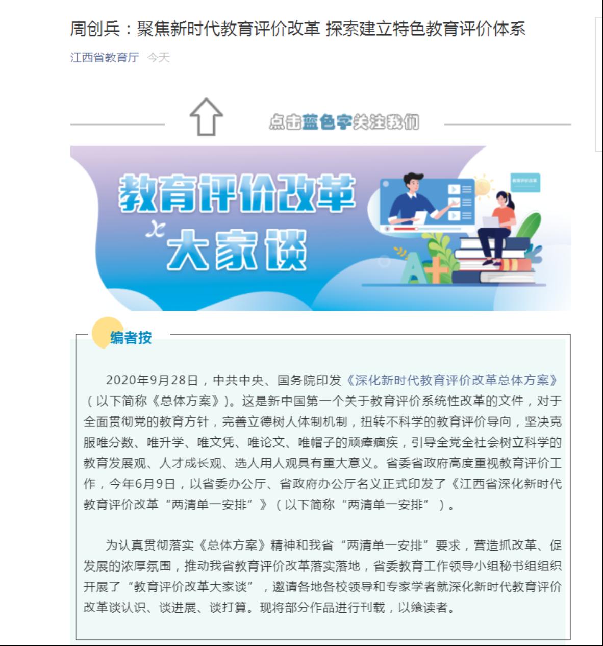 编者按:7月30日,江西省教育厅公众号刊发校长周创兵署名文章《聚焦新时代教育评价改革 探索建立特色教育评价体系》,全文如下: