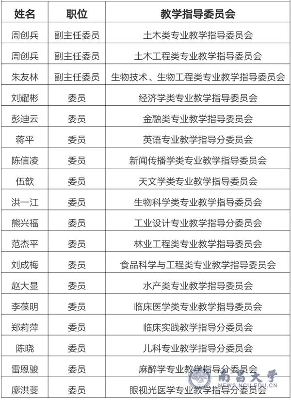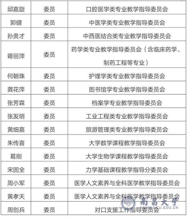 本网讯(教务处)近日,2018-2022年教育部高等学校教学指导委员会(以下简称“教指委”)在北京正式成立。新一届教指委涵盖了2个综合类、109个专业类和40个分教指委,集中了高等教育方面最权威的专家。新一届教指委最终遴选出委员5550人,包括主任委员111人、副主任委员710人,其中3611人是新任委员,占委员总数的2/3,是规模最大、覆盖最全、水平最高的一届教指委。南昌大学共有33人次入选,含25个教指委和7个分教指委,比上一届增长50%,在全国高校排名第30位,“Z14”高校第2位,江西省第1位,创历史新高。其中,副主任委员3人次,委员30人,周创兵教授入选土木类专业教学指导委员会和土木工程类专业教学指导委员会副主任委员,朱友林教授入选生物技术、生物工程类专业教学指导委员会副主任委员,刘耀彬、彭迪云教授等30人入选教指委委员。