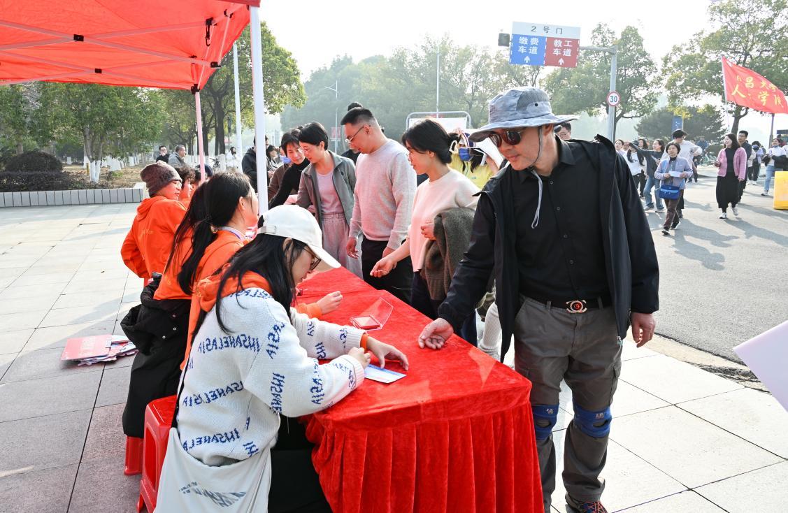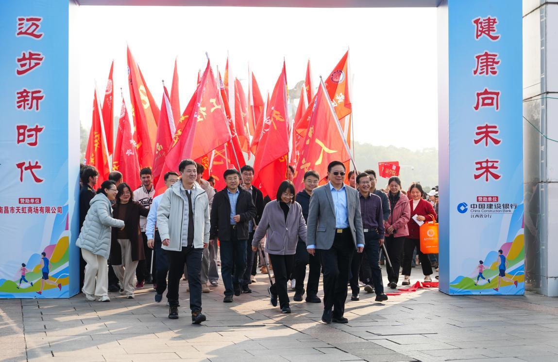 校党委书记罗嗣海、副校长葛刚、平卫英,学术副校长董安平,校党委常委刘建光、徐亮、谈振兴,建行江西省分行党委委员、副行长兼南昌分行党委书记、行长张军,建行南昌分行党委委员、副行长敖松林与近2400名教职工从前湖校区学府大道正门出发,启程香樟校园之旅。