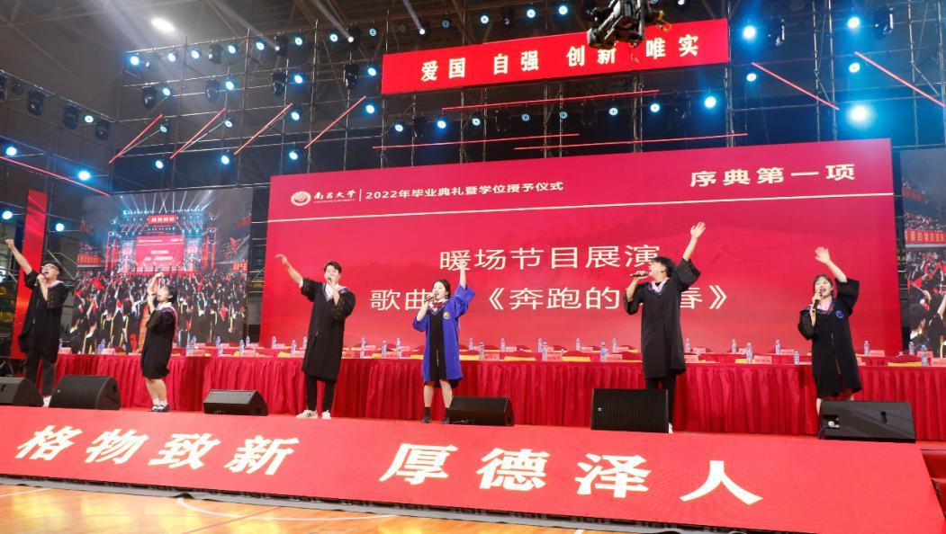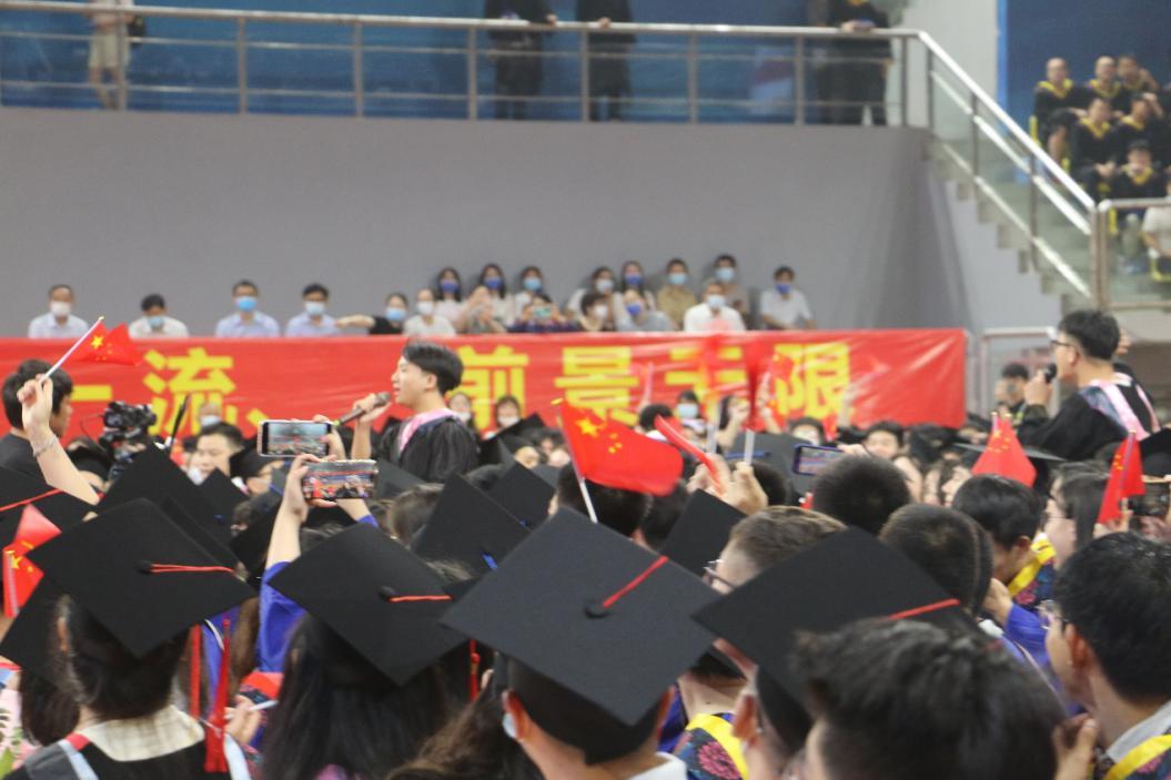 暖场环节,歌声缓缓从人群里传开,将毕业学子的心事款款诉说,一曲《少年》道出了眷恋和不舍。经过大学的历练,小小少年终于长大,永葆青春锐气,向新的前方迈去。
