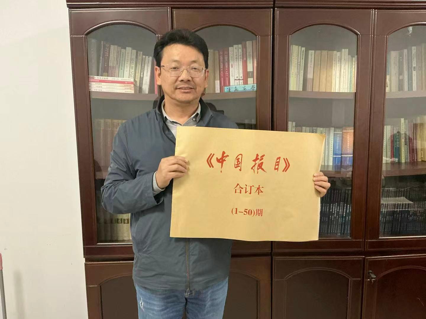 余玉老师向采访同学分享自己田野调查中获赠的《中国报目》合订本。学生边宇童/摄