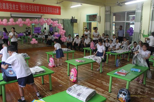 叠毯子、装文具、整理书包……当校领导一行走进幼儿园活动室,这里正在举行一场别开生面的比赛,全场幼儿兴高采烈的欢呼声、加油声一浪高过一浪。此外,幼儿园还开展了低龄幼儿穿衣穿鞋比赛、儿童书画展、教室环境布置等系列活动,提高幼儿生活自理能力的同时,营造了欢乐愉快的节日氛围。