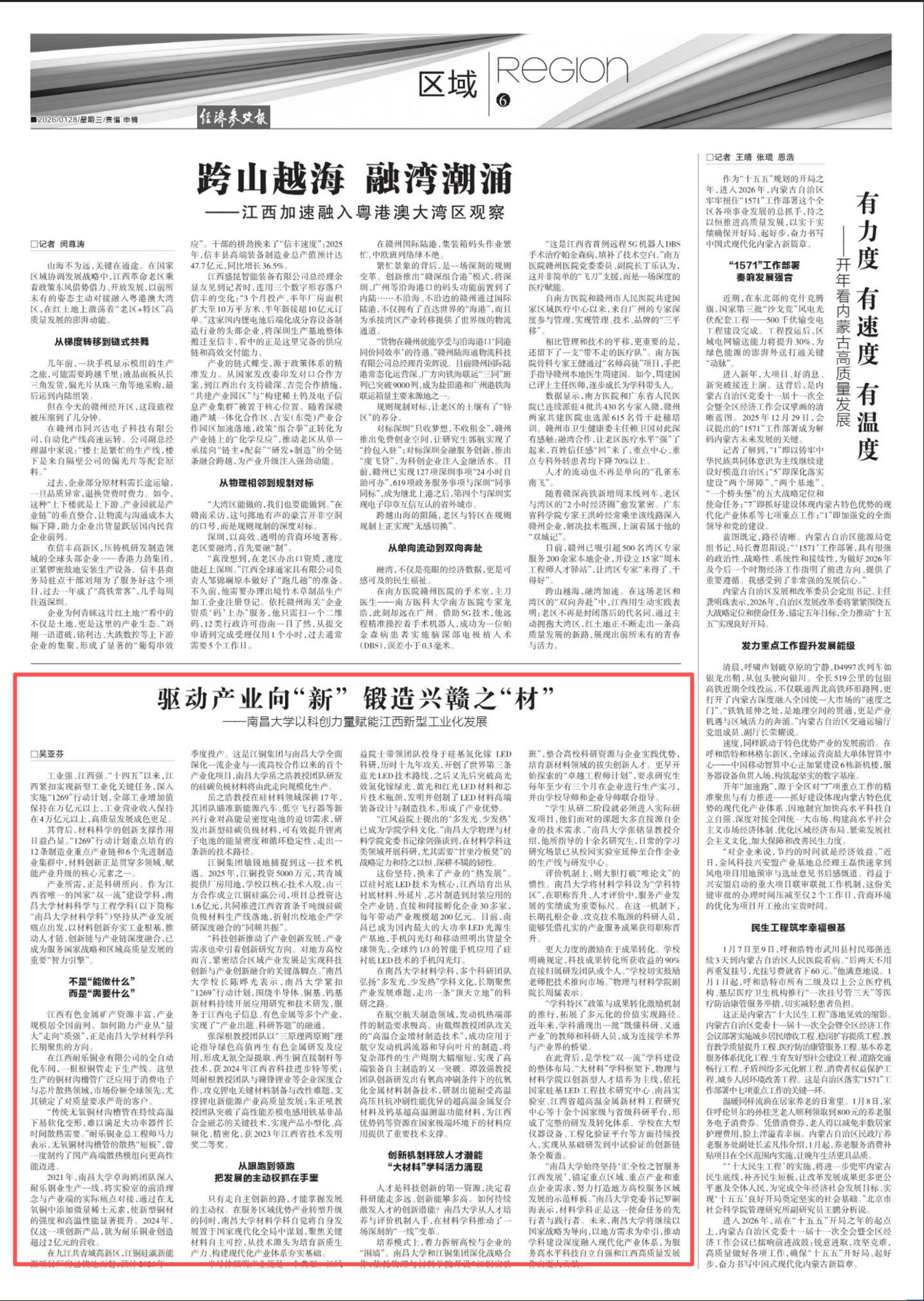编者按:为深入学习贯彻党的二十届四中全会精神,全面落实习近平总书记关于教育的重要论述以及考察江西、视察南昌大学的重要讲话精神,回顾总结南昌大学“十四五”期间发展成就,科学谋划“十五五”时期发展蓝图,特开设【一路耕耘一路歌】专栏。专栏聚焦学校强化党的建设、深耕思政教育、夯实学科建设、建强人才队伍、推动文化传承、守护医疗健康、服务国家战略、助推地方发展、建设一流大学等方面推出系列报道,展现学校扎根红土地、奋进新时代的生动实践。本期刊发《经济参考报》、新华网刊发的题为《驱动产业向“新”锻造兴赣之“材”——南昌大学以科创力量赋能江西新型工业化发展》的文章,报道我校材料科学与工程学科坚持从产业发展痛点出发,以材料创新夯实工业根基,推动人才链、创新链与产业链深度融合,已成为服务国家战略和区域高质量发展的重要“智力引擎”。内容如下: