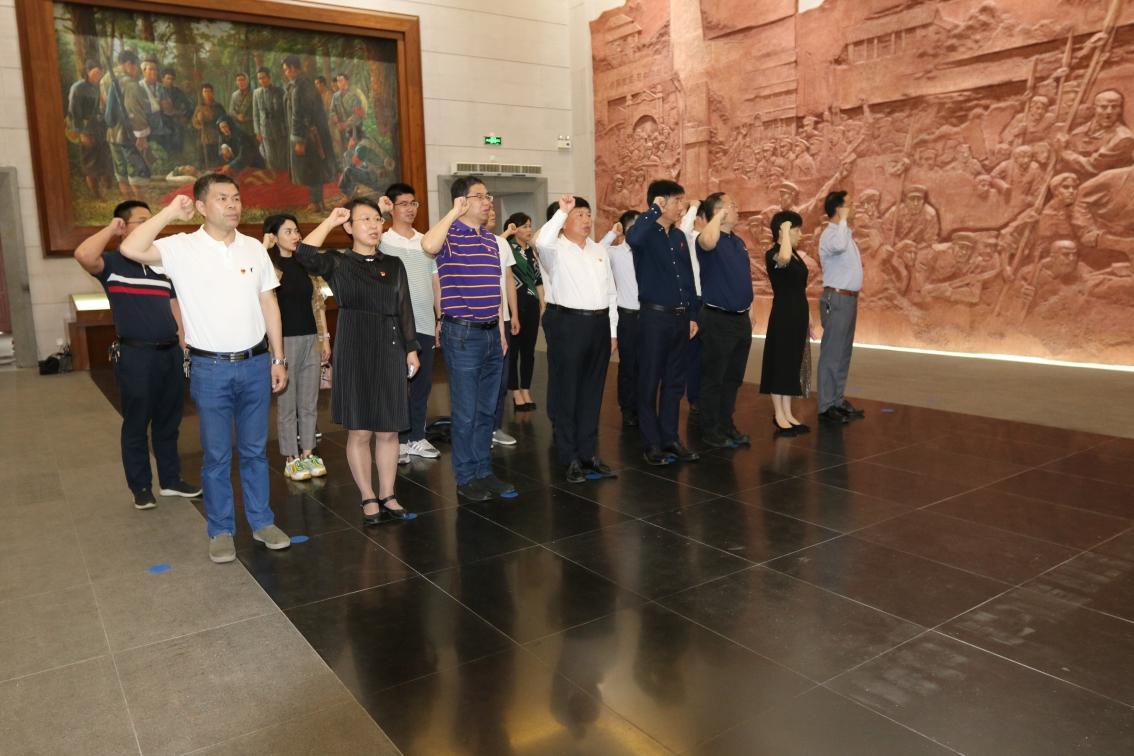 在庄严肃穆的革命烈士纪念堂大厅,全体党员干部面向烈士雕像行鞠躬礼,并在党委书记何海翔同志的领誓下集体重温入党誓词。