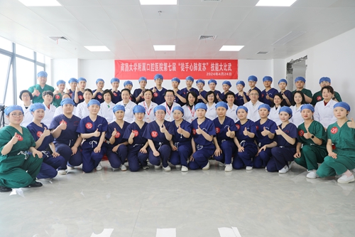 本网讯(附属口腔医院 刘洁)4月24日上午,南昌大学附属口腔医院工会、共青团委、医务部、护理部在红谷滩院区联合举办了第七届心肺复苏大比武,来自全院22个部门的36名青年职工齐聚一堂,共同参与这场紧张刺激的技能竞赛。院长杨健、党委副书记严晓兰出席并担任巡考,确保比赛的公平、公正与公开。