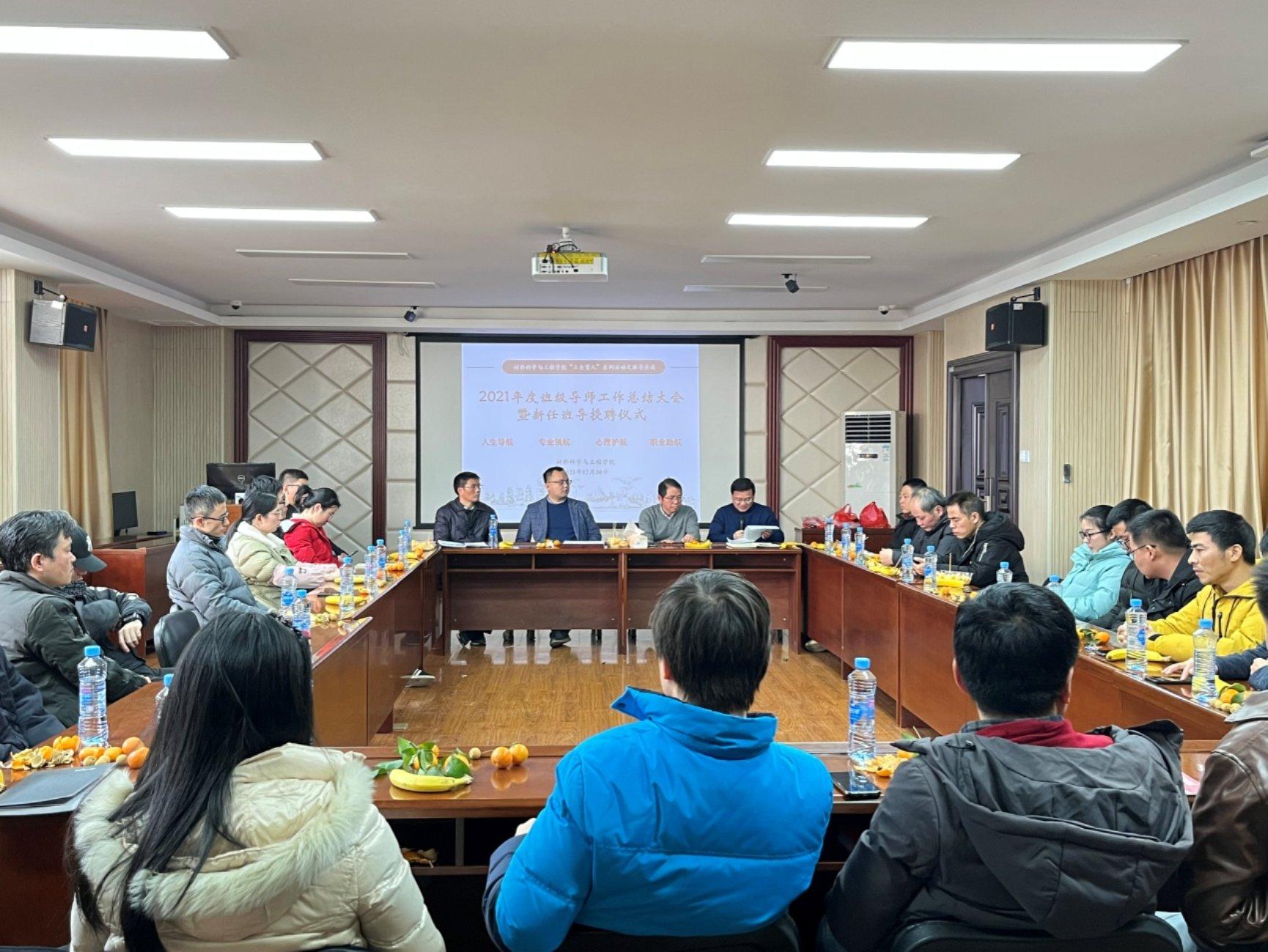 本网讯(材料科学与工程学院)12月30日上午,材料科学与工程学院组织召开2021年度班级导师工作总结大会暨新任班导授聘仪式。院长唐建成、党委副书记陈嘉、教学副院长周耐根与学院本科4个年级的共计40余名班级导师齐聚一堂交流畅谈,气氛温馨而热烈。会议由党委副书记陈嘉主持。