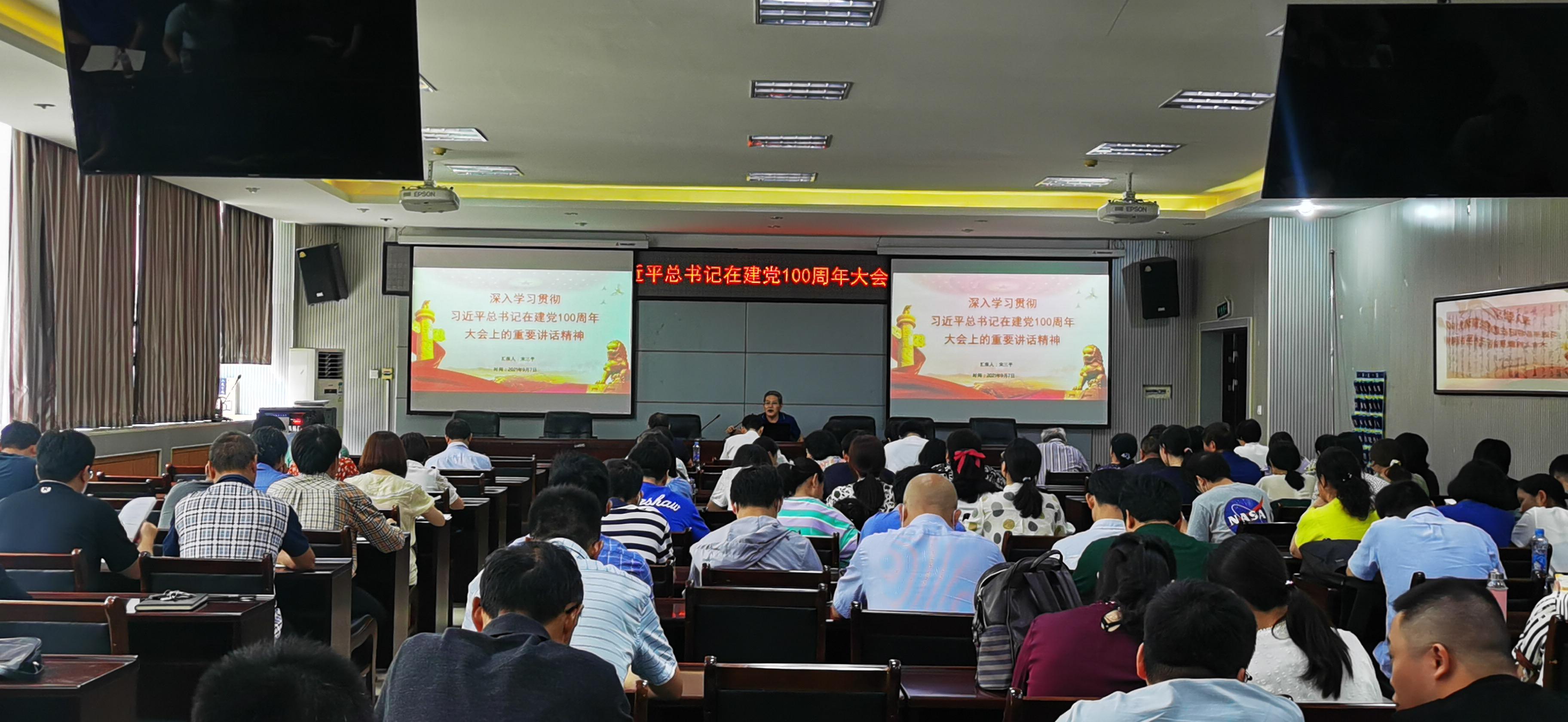 宋三平书记从一个庄严宣告——全面建成了小康社会;一个伟大梦想——实现中华民族伟大复兴;一个伟大精神——对党忠诚、不负人民;九个必须——以史为鉴、开创未来;一个殷切期望——不负时代,不负韶华;一个号召——努力为党和人民争取更大光荣等6个方面对习近平总书记在建党100周年大会上的重要讲话精神进行了详细的阐述,并激励全体教职工牢记初心使命,坚定理想信念,践行党的宗旨,永远保持同人民群众的血肉联系,继续为实现人民对美好生活的向往不懈努力,努力为党和人民争取更大光荣!