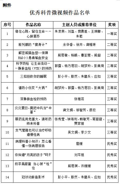 本网讯(南昌大学第一附属医院)近日,由江西省科学技术厅主办的第三届江西省科普微视频大赛落下帷幕。本次大赛共有552部参赛作品推荐入围,最终经形式审查和多轮次的专家评审后,共150部作品获奖。经过激烈的角逐,南昌大学第一附属医院共有17项作品在大赛中获奖,其中包括一等奖1项,二等奖3项,三等奖6项,优秀奖7项,并荣获优秀组织单位。