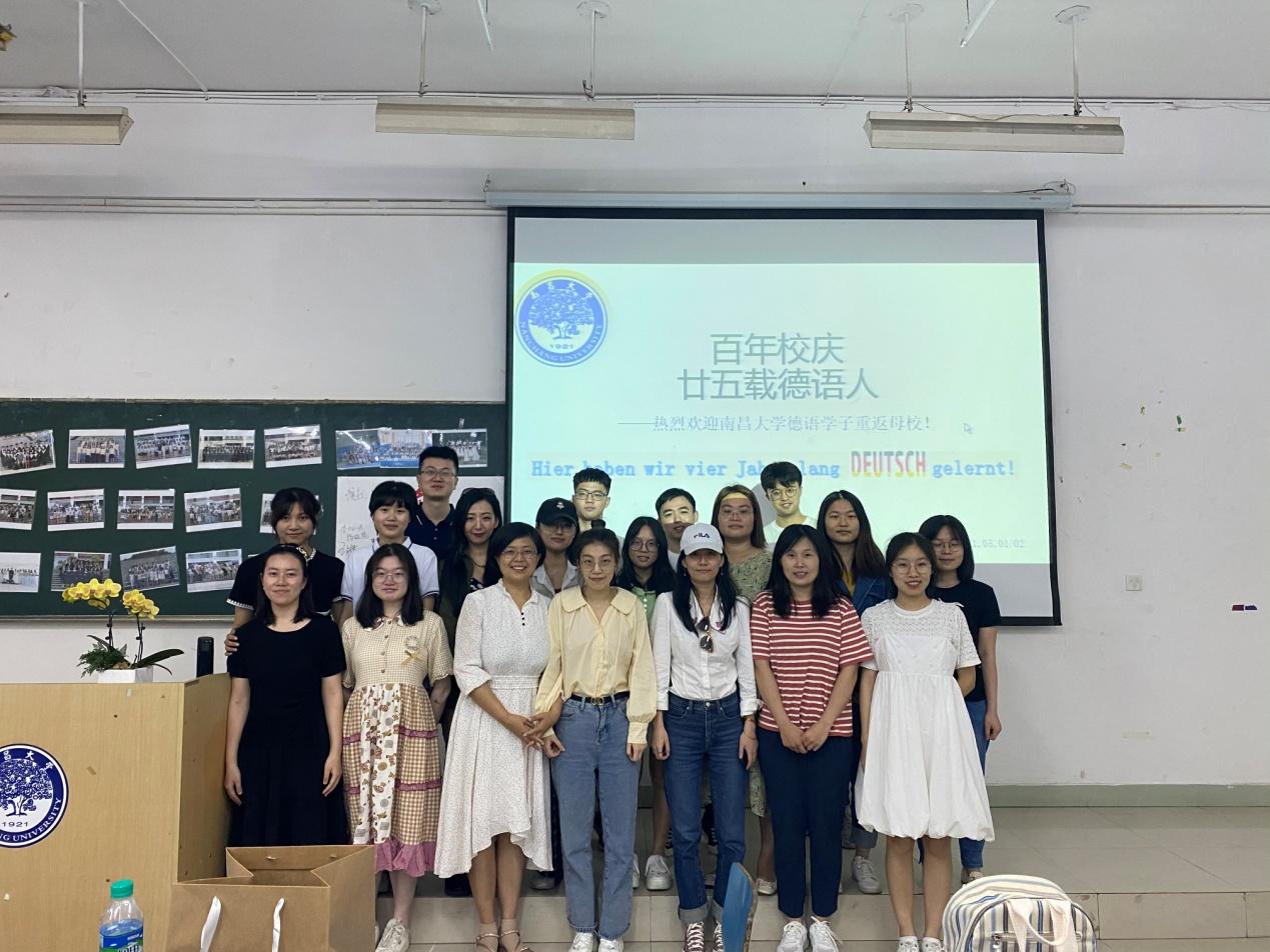 本网讯(外国语学院)5月1日下午和2日上午,值南昌大学百年校庆之际,外国语学院德语专业在外经楼102室喜迎德语校友返回母校参加校庆活动,并组织了两场校友经验分享座谈会,旨在为在校生提供更多的思路以明确自己未来的发展方向,避免踩“雷”。座谈会由德语教研室主任刘婷婷老师主持,来自全国各地近30名德语校友在座谈会上分享了他们的大学生活、学习经验以及工作经历等。